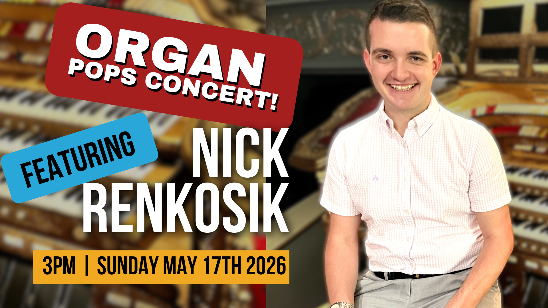Based out of out of Kenosha, WI, nestled between Chicago and Milwaukee, Nick Renkosik is a nationally acclaimed organist that has performed at such venues as Sanfilippo’s Place De La Musique in Barrington Hills, IL; the Oriental and Riverside Theatres in Milwaukee, WI; the Coronado Theatre in Rockford, IL; the Allen Organs of Chicago Showroom; the Rialto Theatre in Joliet, IL; the Tampa Theatre in Tampa, FL; the Fox Theatre in St. Louis, MO; the Nethercutt Collection in Sylmar, CA; Orchestra Hall in Chicago, IL, Church of the Gesu in Milwaukee, WI; the Auditorium Theatre in Rochester, NY; Babson College in Wellesley, MA; etc.